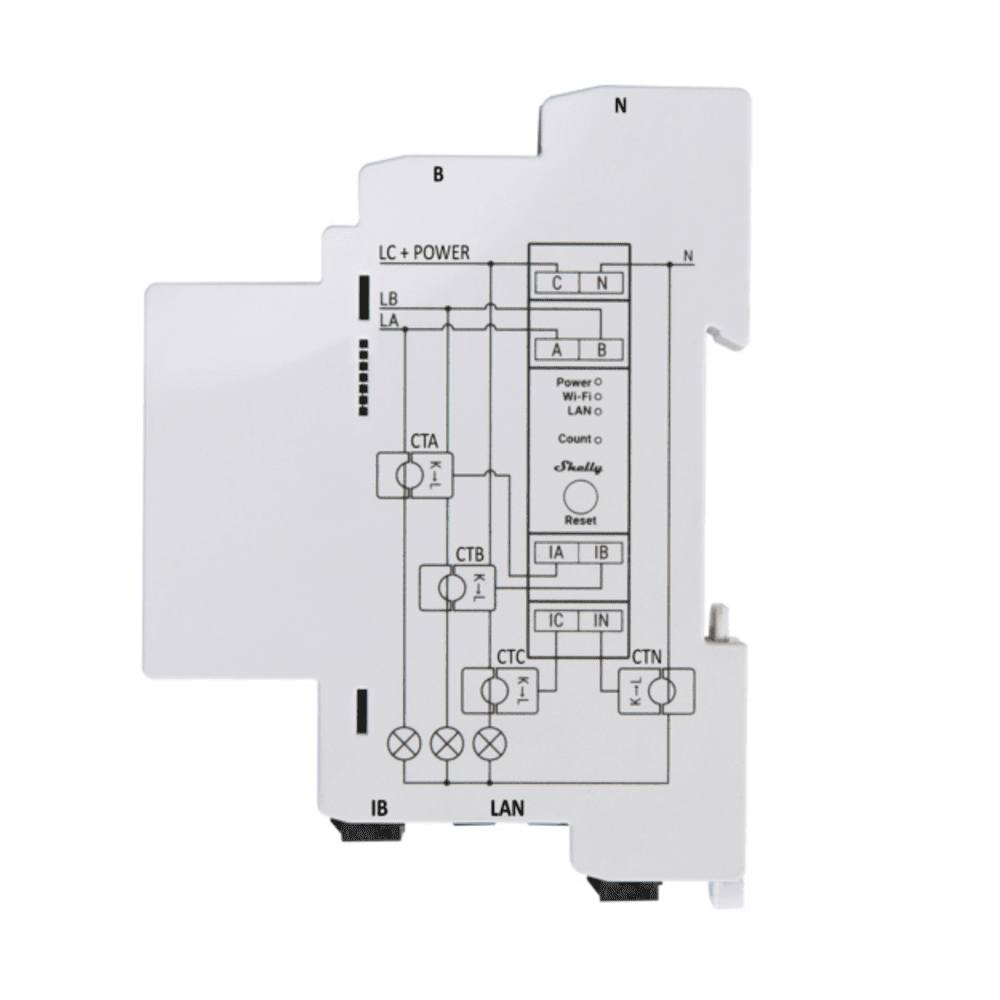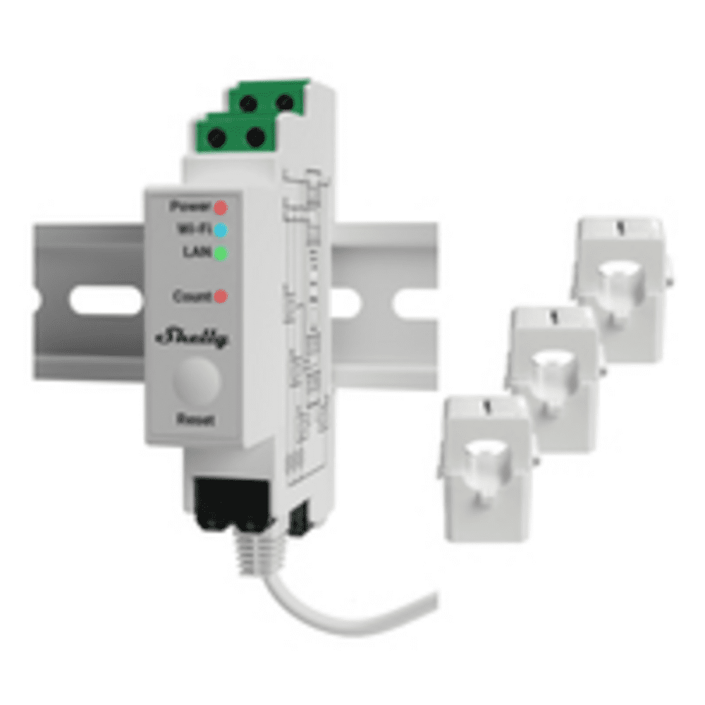 Der Shelly Pro 3EM ist ein WLAN-betriebenes, DIN-montierbares 3-Phasen-Stromverbrauchsmessgerät mit WLAN-, Bluetooth- und LAN-Konnektivität.